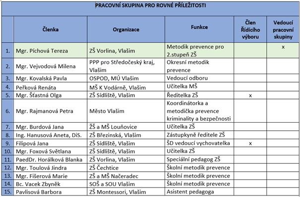 Do činnosti pracovní skupiny jsou zapojeni zejména ředitelé, zřizovatelé, pedagogičtí pracovníci, pracovníci poradenských zařízení, pracovníci s dětmi a mládeží i rodiče.