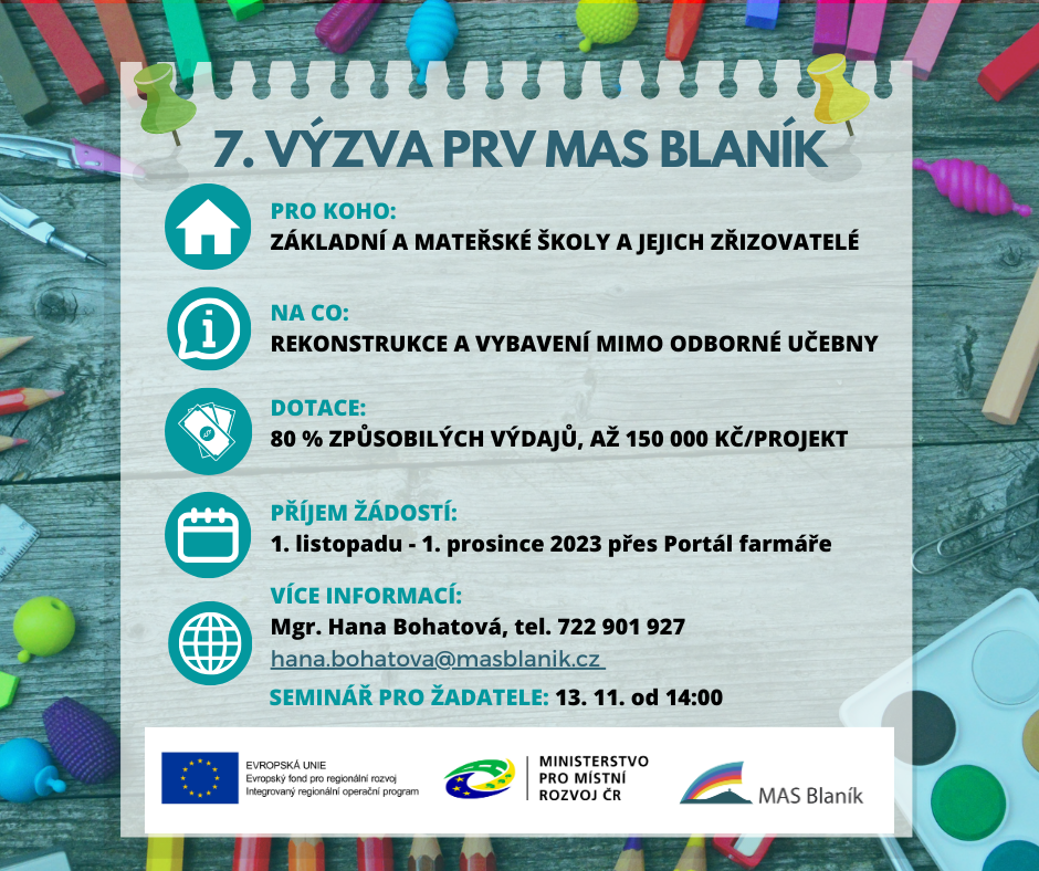 1. listopadu vyhlásí MAS Blaník další dotační výzvu v Programu rozvoje venkova. Své projekty v ní mohou předkládat mateřské a základní školy z území MAS nebo jejich zřizovatelé. Podporu mohou získat na rekonstrukci a vybavení kmenových učeben a dalšího zázemí škol a školek včetně jídelen. MAS Blaník na tuto oblast vyčlenila poslední zbývající prostředky pro PRV na stávající období, které k datu vypsání výzvy činí 351 582 Kč. Kč. V předchozích výzvách bylo tímto způsobem financováno například pořízení nových technologií do školních kuchyní v Čechticích a na ZŠ Sídliště ve Vlašimi, nebo nábytkové vybavení kmenových tříd a neodborných kabinetů v Louňovicích pod Blaníkem a na ZŠ Vorlina ve Vlašimi. Tentokrát mohou zájemci z řad základních a mateřských škol a jejich zřizovatelů podávat na MAS Blaník žádosti o dotaci na obdobné projekty od 1. listopadu do 1. prosince.