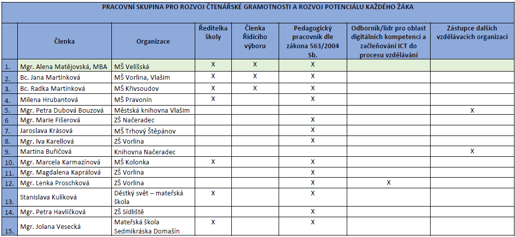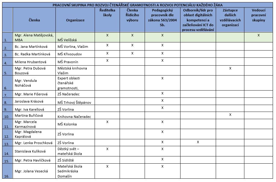 Do činnosti pracovní skupiny jsou zapojeni učitelé lídři/experti z daného území. Minimálně jeden člen PS je pedagogický pracovník dle zákona č. 563/2004 Sb. ve znění pozdějších předpisů s minimálně pětiletou praxí v základní škole.