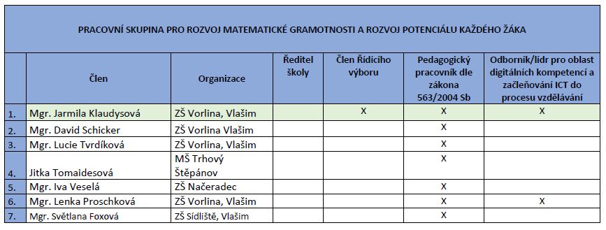 Do činnosti pracovní skupiny jsou zapojeni učitelé lídři/experti z daného území. Minimálně jeden člen PS je pedagogický pracovník dle zákona č. 563/2004 Sb. ve znění pozdějších předpisů s minimálně pětiletou praxí v základní škole