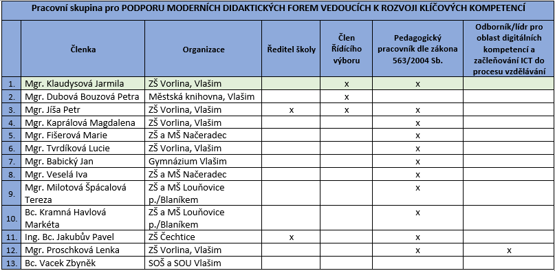 Obsahem činnosti skupiny je výměna odborných znalostí o moderních didaktických formách, metodách, pomůckách a postupech, které vedou k rozvoji klíčových kompetencí žáků a projednání podkladů a dokumentů v rámci realizace akčního plánování. Výsledkem práce ve skupině budou zpracované návrhy spolupráce a aktivity škol v oblasti moderních didaktických forem vedoucích k rozvoji klíčových kompetencí i seznam místních lídrů v této oblasti.