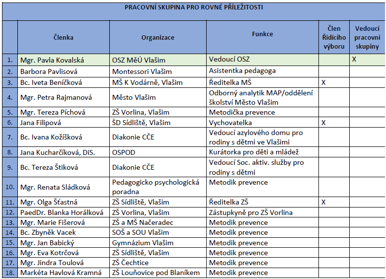 Do činnosti pracovní skupiny jsou zapojeni zejména ředitelé, zřizovatelé, pedagogičtí pracovníci, pracovníci poradenských zařízení, pracovníci s dětmi a mládeží i rodiče.