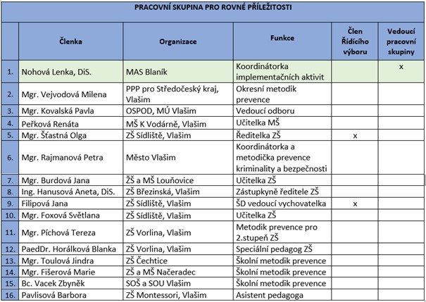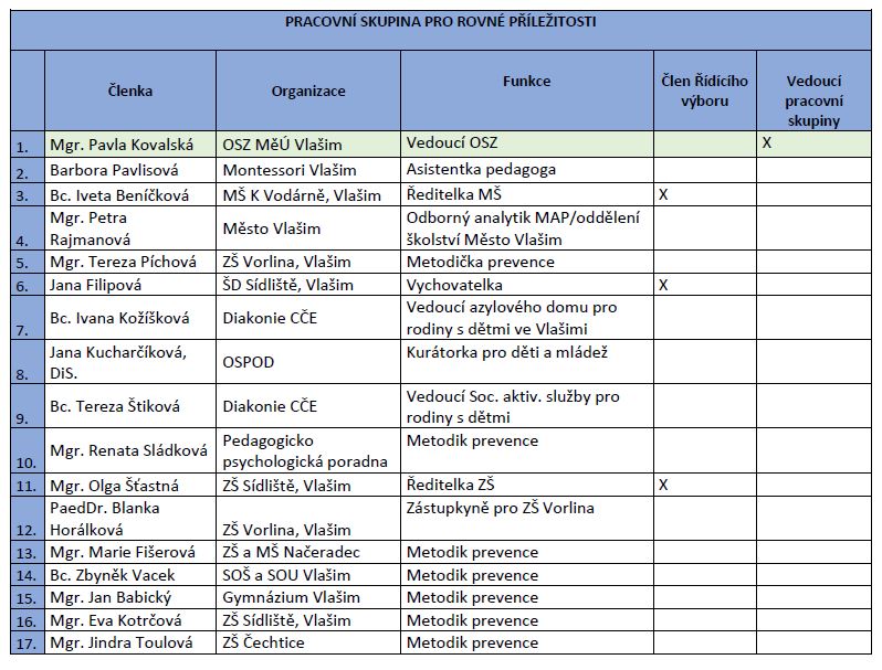Do činnosti pracovní skupiny jsou zapojeni zejména ředitelé, zřizovatelé, pedagogičtí pracovníci, pracovníci poradenských zařízení, pracovníci s dětmi a mládeží i rodiče.