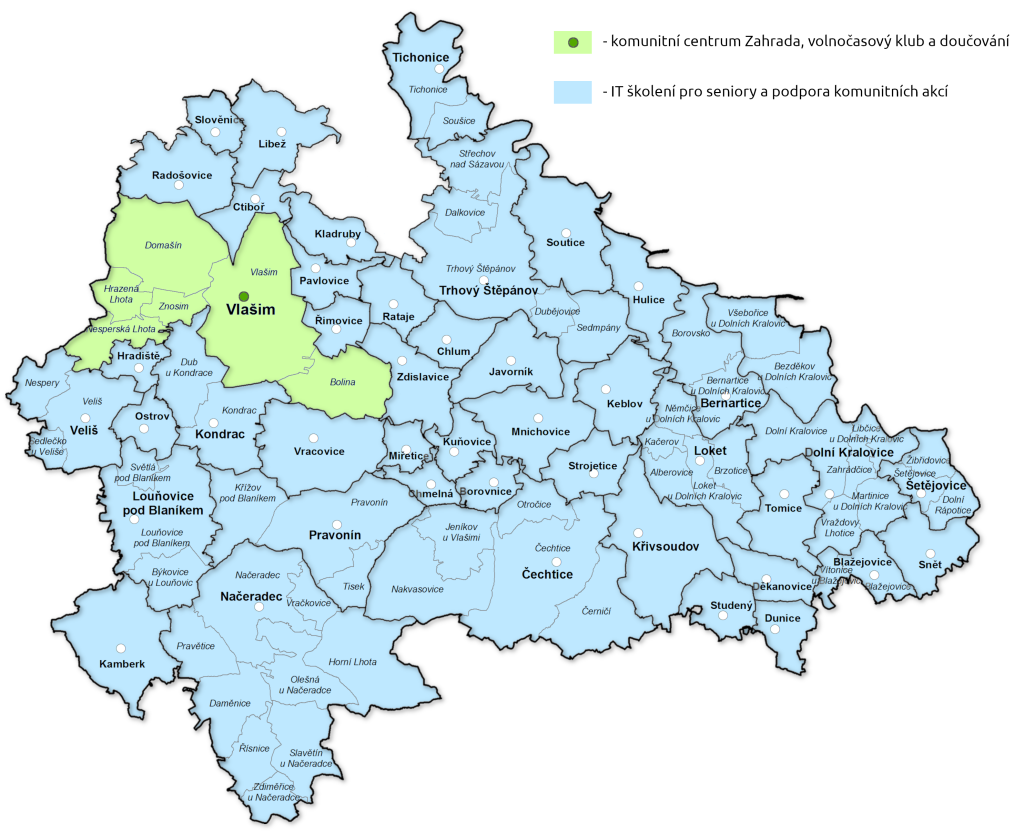 Charita Vlašim díky zapojení do projektu může nadále realizovat komunitní a aktivizační programy pro seniory, osoby se zdravotním postižením, ale i pro rodiny s dětmi a mládež. Jedná se o široké spektrum aktivit např. literární a filmové kluby, výtvarné dílničky pro děti a maminky, klub šití a háčkování, zdravotní cvičení, setkávání v rámci klubu seniorů a různé přednášky.