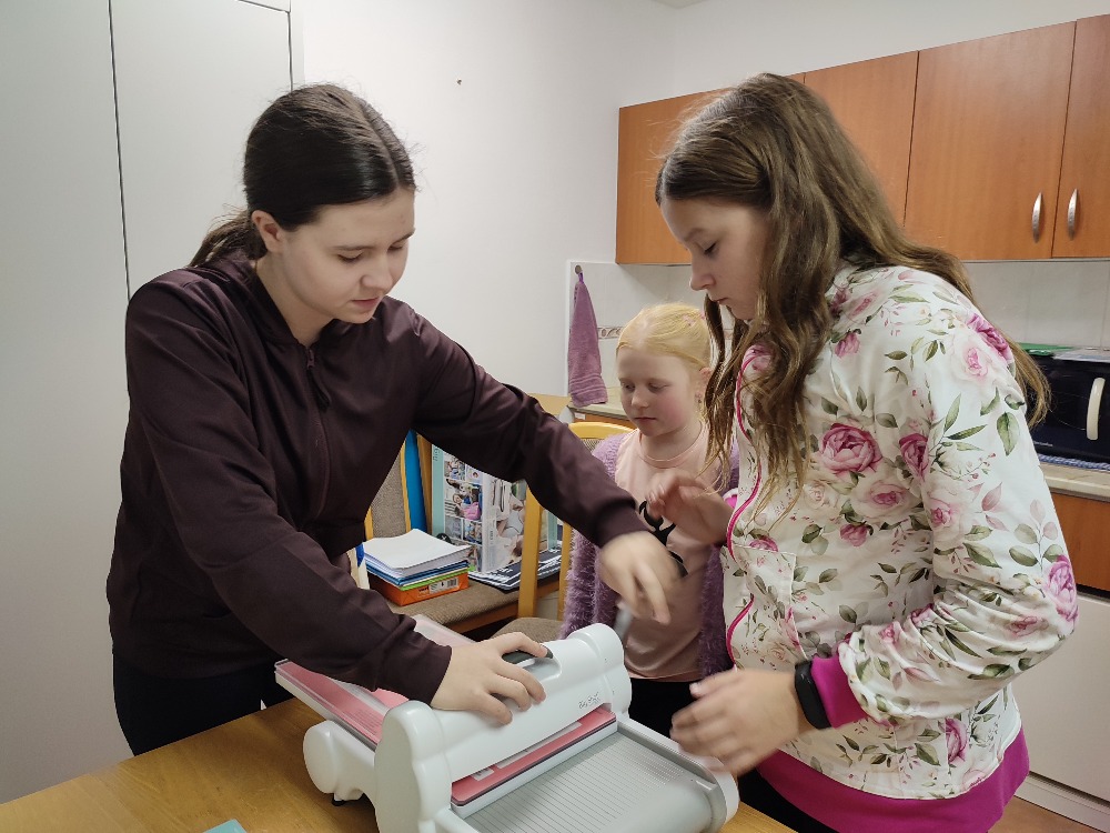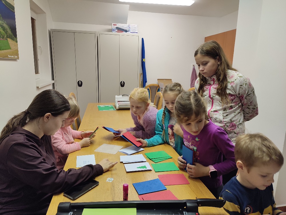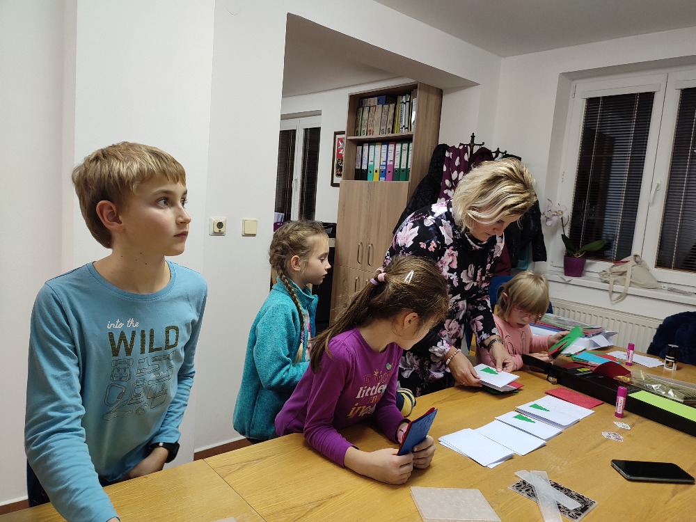 - Na fotografiích vyrábí vánoční přání pro seniory v obci.