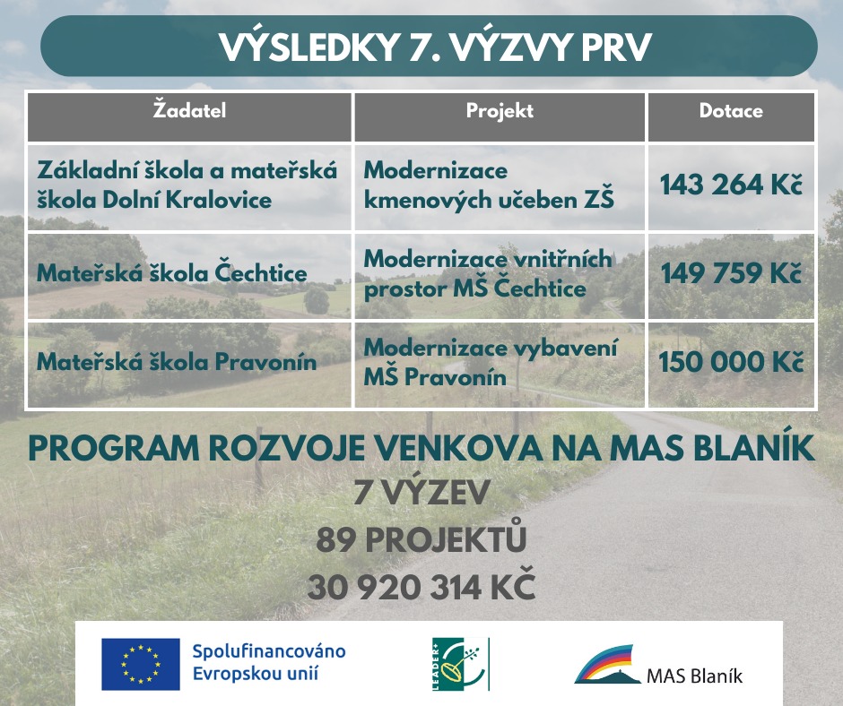 V lednu také MAS Blaník uzavřela definitivně poslední dotační výzvu z Programu rozvoje venkova (PRV). Výzva byla zaměřena na menší projekty ZŠ a MŠ a uspěla v ní Mateřská škola Pravonín s žádostí na vybavení tříd a školní kuchyně, Základní a mateřská škola Dolní Kralovice s žádostí na modernizaci výpočetní techniky a Mateřská škola Čechtice s projektem obnovy nábytkového vybavení. Na tyto projekty MAS Blaník rozdělila částku 443 022 Kč.
