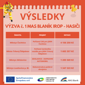 První výzvu z IROP v novém dotačním období směřovala MAS Blaník na nákupy nového vybavení jednotek sboru dobrovolných hasičů a výstavbu hasičáren. Z osmi podaných žádostí byly v únoru vybrány k podpoře čtyři a radost z dotace tak mají hasiči v Čechticích, Zdislavicích, Trhovém Štěpánově a v Louňovicích pod Blaníkem. Na své projekty získají z MAS Blaník celkovou podporu více než 8 300 000 Kč.
